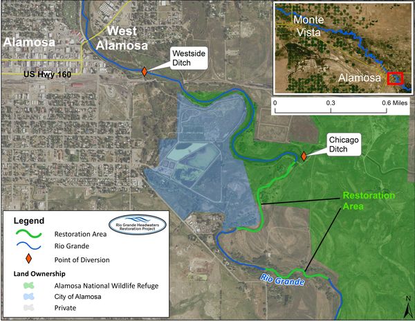 The Rio Grande Corridor Restoration Project at Alamosa National Wildlife Refuge brings together the U.S. Fish and Wildlife Service (USFWS), RGHRP, Colorado Parks and Wildlife (CPW), City of Alamosa, and private landowners to address challenges facing the Rio Grande by stabilizing streambanks, restoring riparian areas, and enhancing aquatic habitats. These activities will reduced sediment entering the river, improved riparian and aquatic habitat, while reconnecting the river to its floodplain and revitalizing riparian wetlands.