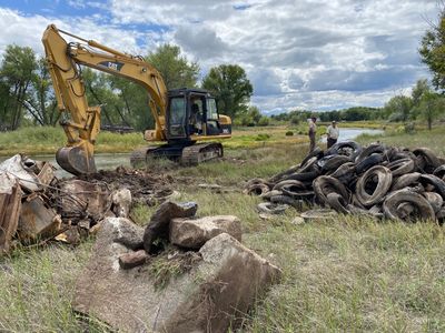In September 2022, USFWS staff removed trash along the riverbanks in the project area. This included roughly 24 old cars bodies 200,000 lbs of concrete, 20 appliances, and many trailer loads of tires. In October 2022, Cooley and Sons Excavating mobilized and completed channel and bank shaping, installation of rock and rootwad stabilization and habitat structures, and planting of willows within the project area. Final construction activities and reseeding took place in the fall of 2023, including a community volunteer day to plant native shrubs, clean trails, and protect existing riparian growth.